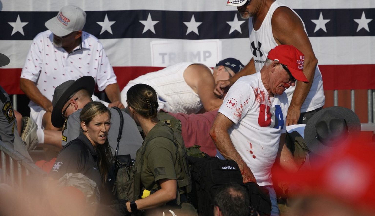 • Agenti odvode ozlijeđenog DOnalda trumpa na sigurno nakon pucnjave na njegovom skupu Foto: Afp